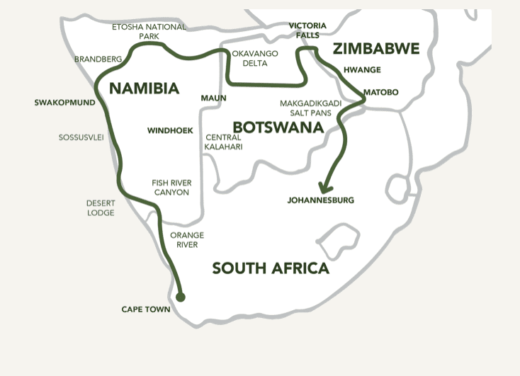 Dag 1: Vlucht Amsterdam - tussenstop - Kaapstad Dag 2: Aankomst Kaapstad Dag 2,3,4: Kaapstad Dag 5: West Coast / Namaqualand Dag 6: Oranjerivier Dag 7: Fish River Canyon Dag 8,9: Namib Desert Reserve Dag 10: Sossusvlei Dag 11,12: Swakopmund Dag 12: Spitzkoppe Dag 14,15: Etosha Dag 16: Caprivi Dag 17,18: Okavango Delta Dag 19: Maun Dag 20: Makgadikgadi Pans Dag 21: Chobe - Victoria Falls Dag 22: Victoria Falls Dag 23: Vlucht Victoria Falls - tussenstop - Amsterdam Dag 24: Amsterdam
