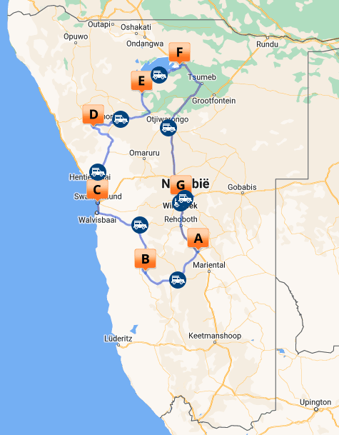 Dag 1: Amsterdam - tussenstop - Windhoek Dag 2: Aankomst Windhoek Dag 2,3: Kalahari Woestijn, Teufelskrallen Tented Lodge Dag 4,5: Sossusvlei, The Elegant Desert Lodge Dag 6,7: Swakopmund, Swakopmund Guesthouse Dag 8,9: Damaraland, Twyfelfontein Adventure Camp Dag 10: Etosha National Park, Toshari Lodge Dag 11,12: Etosha National Park, Onguma Forest Camp Dag 13: Windhoek, The Elegant Guesthouse Dag 14: Windhoek - tussenstop - Amsterdam Dag 15: Aankomst Amsterdam